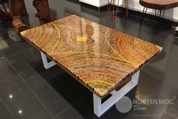 Converging two special universal elements in one artistic work, Sun Over the Rainbow Colored-Pencil Coffee Table deserves a unique masterpiece of interior design. The sun – the center of the planets in the solar system represents the inextinguishable vitality that every creature is desired for. Besides, four rainbows at four directions East – West – North – South is the memorable presents after the heavy rains. No matter where you come from, you will be worthily rewarded if you make efforts and try your best. That special meaning helps the handicraftsman be inspired to create an innovative product – Sun Over the Rainbow Colored-Pencil Coffee Table which will be the highlight in your home. With the harmonious colors that were elaborately matched, you will not have to concern about the decorative accessories because the table itself is the best decoration. Now, contact Nguyen Moc Décor to possess this unique masterpiece!